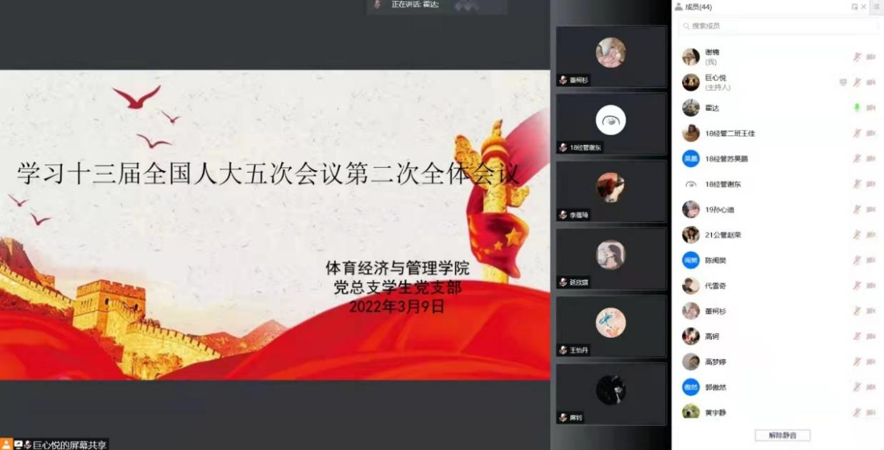为学习贯彻十三届全国人大五次会议第二次全体会议精神,体育经济与管理学院学生党支部于3月9日下午1900在线上召开《学习第十三届全国人大五次会议第二次全体会议》主题党日活动,参加此次活动的成员有霍达同志、胡雪妍同志、任琳同志以及学生党支部全体党员同志。
