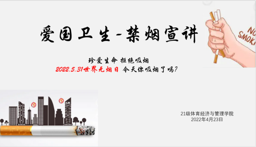 为树立和展现我院全体学生良好的精神面貌,养成良好文明的生活习惯,创造文明、洁净、优美的校园环境。2022年4月23日晚七点于腾讯线上会议,2021级体育经济与管理学院鄠邑校区全体学生参加了学院组织的“爱国卫生-禁烟宣讲”活动。