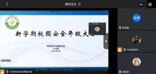 为了增强同学们的安全意识,确保同学们在防疫期间做好安全防护, 2022年3月11日体育经济与管理学院2018级在腾讯会议开展了“安全教育”线上会议,本次会议由2018级辅导员胡雪妍主持, 18级全体学生参加。