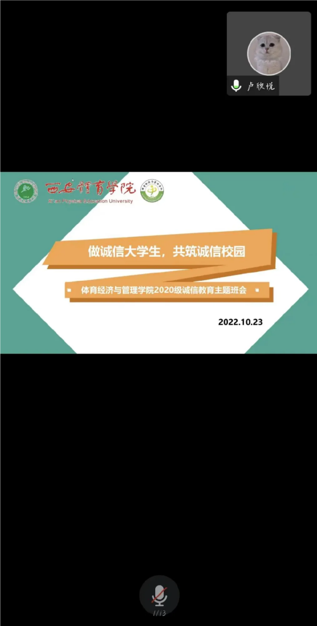 01为进一步提高大学生诚信意识和责任意识,强化学生诚信品质,大力营造诚信、励志的校园文化氛围。10月23日晚上20点,体育经济与管理学院召开2020级诚信教育主题会议暨年级大会,会议由2020级辅导员卢欣悦主持,2020级全体学生参加了会议。