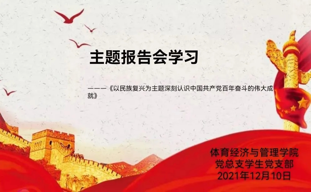 为了深入学习贯彻党的十九届六中全会精神,从百年党史中汲取智慧和力量,学习领悟党的百年历史,体育经济与管理学院团委、学生党支部于2021年12月10日上午组织学习《以民族复兴为主题深刻认识中国共产党百年奋斗的伟大成就》专题报告,经管学院学工办主任任琳老师、辅导员霍达老师、胡雪妍老师、学生党员、积极分子、团员代表参加了此次学习。