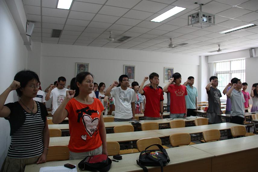 为了庆祝建党九十周年,迎接精神文明校园的评比,增强我系学生党员的使命感。6月27日中午,我系举办了党员宣誓大会。党总支书记智勇、党总支 组织委员边伟、纪检委员魏华、学生支部书记高亚丽、辅导员刘应波和 系全体学生党员参加了本次活动。