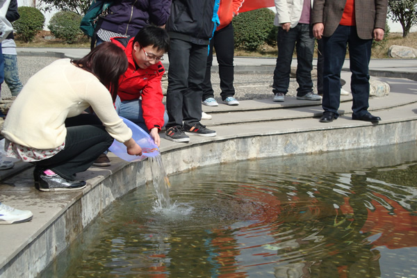 风吹过秋,飘过冬,来到了春日的奥林匹克花园。经过一个沉睡冬日的奥林匹克花园在同学们的一番清理后,顿时焕然一新。随后,在我系智书记的带领下,同学们将买来的小鱼儿倾入池中,鱼儿的欢快畅游伴随着同学们的热情一起舞动起来。