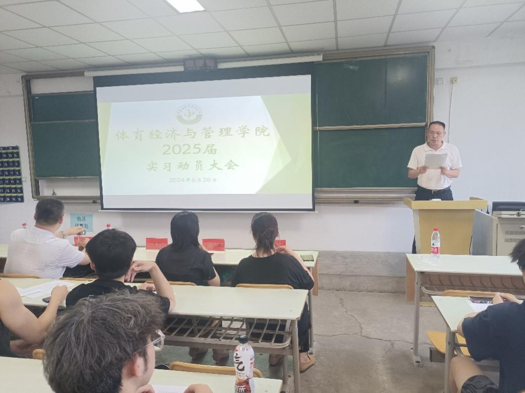 为推进我院2021级学生就业实习工作,帮助我院学生树立正确的就业观和择业观,体育经济与管理学院于2024年6月26日在教学楼202教室召开2025届实习动员大会暨企业宣讲会。体育经济与管理学院院长王鹏,党总支书记陈鑫,副院长张恩利、丁建岚,各教研室主任、年级辅导员以及长龙体育集团股份有限公司综合部经理陈积瑾出席此次大会。本次实习动员大会由丁建岚副院长主持。