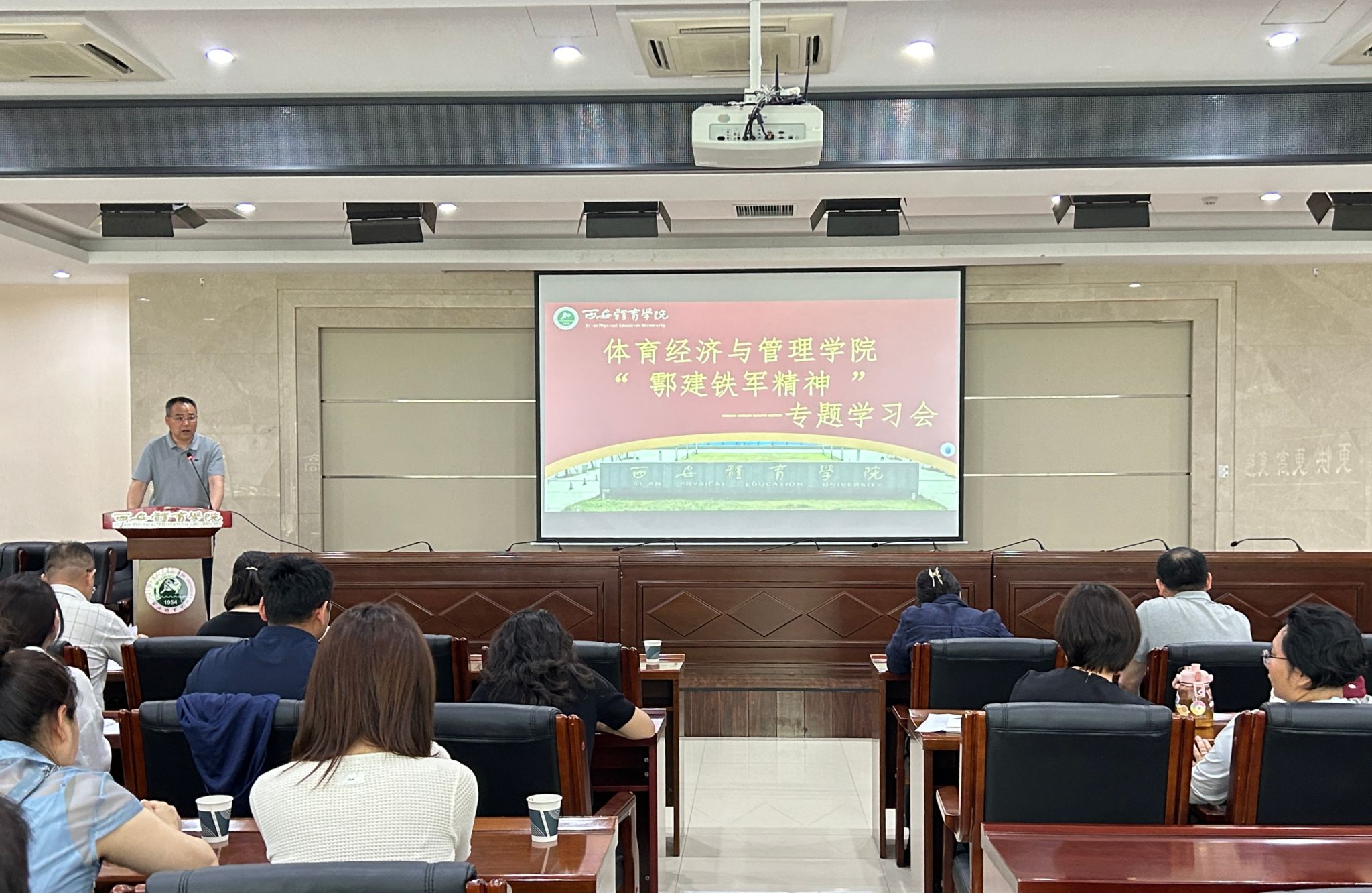 为深入贯彻学校“三年行动计划”与“五个强校”战略目标,积极响应“十大攻坚战”决策部署,英国365上市公司官网体育经济与管理学院于2025年5月7日下午,在含光校区二号行政楼六楼报告厅隆重召开“鄠建铁军精神”专题学习会。会议由学院党委书记陈鑫主持,经管学院全体教职工、本科生及研究生代表共计60余人集中学习活动。