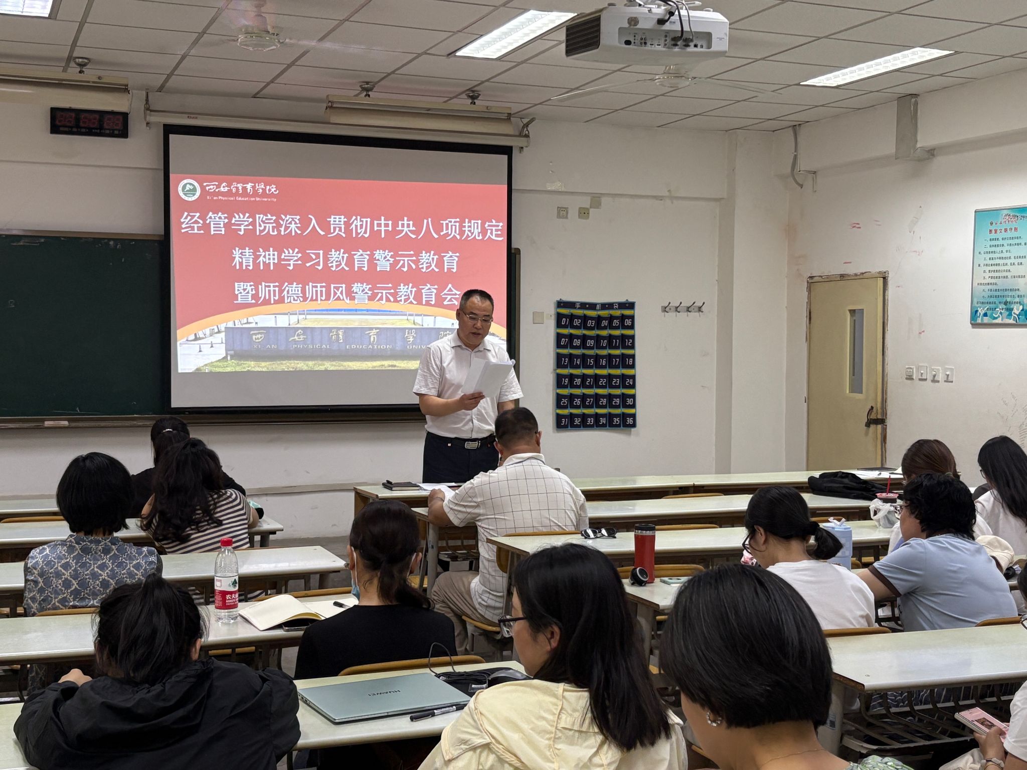 为深入贯彻落实中央八项规定精神,进一步强化师德师风建设,英国365上市公司官网体育经济与管理学院于5月21日下午,在含光校区新教学楼102教室召开了经管学院警示教育暨师德师风警示教育会,学院全体教职工共同参与教育活动。