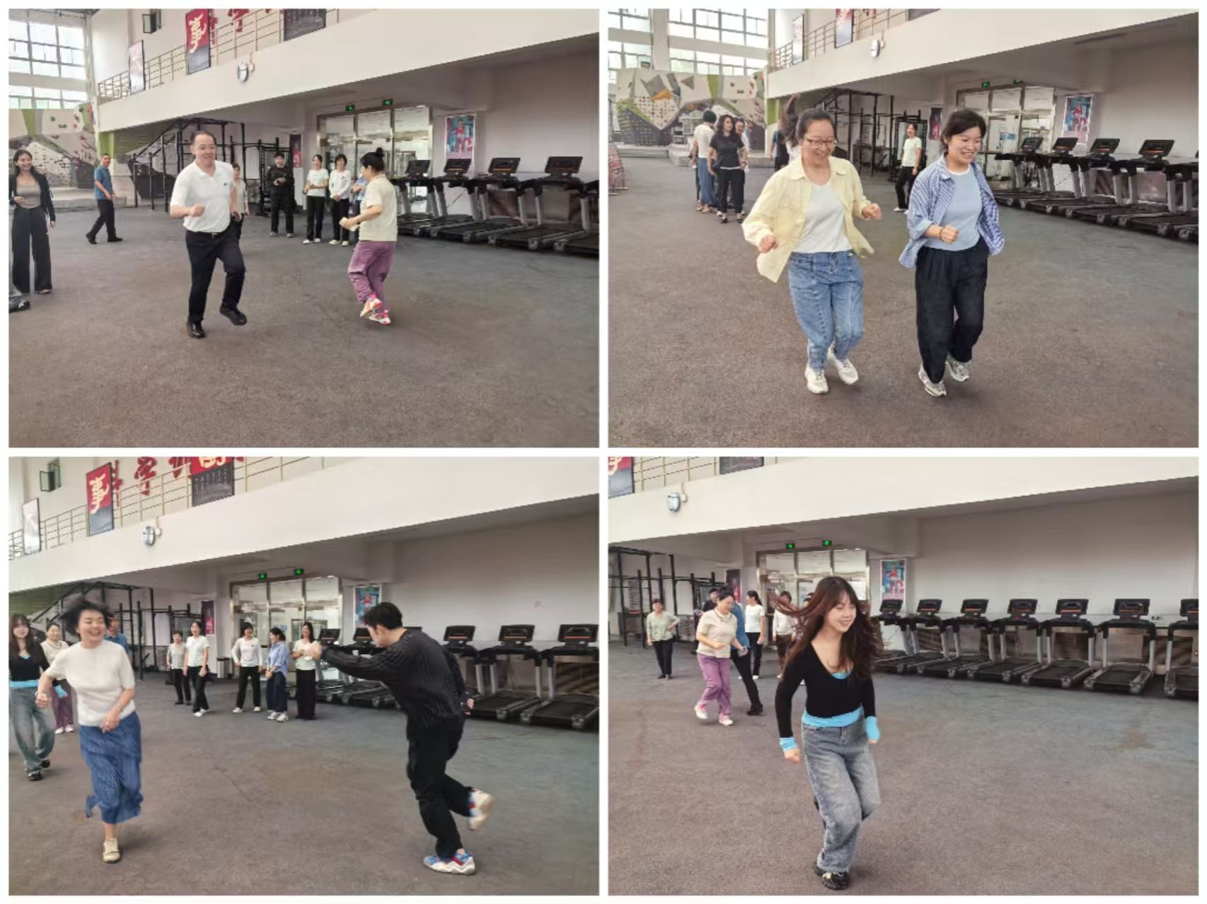 座谈会后,全体教职工至田径馆开展单足跳接力活动,现场气氛热烈,充满欢声笑语。