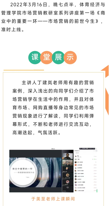 2022年3月16日,晚七点半,体育经济与管理学院市场营销教研室系列讲座第一场《商业中的重要一环——市场营销的前世今生》,准时上线。