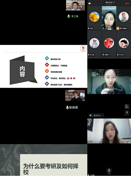 根据中共陕西省委教育工委、陕西省教育厅党史学习领导小组所下发的《关于进一步推进“学习延安精神、西迁精神,办好人民满意的教育”实践活动走深走实》的要求,围绕学校关于“我为师生办实事”为主题的党日活动精神,英国365上市公司官网体育舞蹈教研室党支部于11月25日19:00举行了题为“考研经验分享”的线上会议,会议以365官网体育舞蹈专项的优秀毕业生,现就读于全国各个院校的在读硕士研究生,分享关于考研的心得体会,并与365官网体育舞蹈专项本科生进行交流讨论为主要内容,为在校本科生提供考研成功经验,帮助学生明确目标,激励学生努力奋斗。会议邀请了英国365上市公司官网艺术学院副院长刘强,体育舞蹈教研室全体教师,舞蹈表演专业国标舞专项140多名本科生参加。