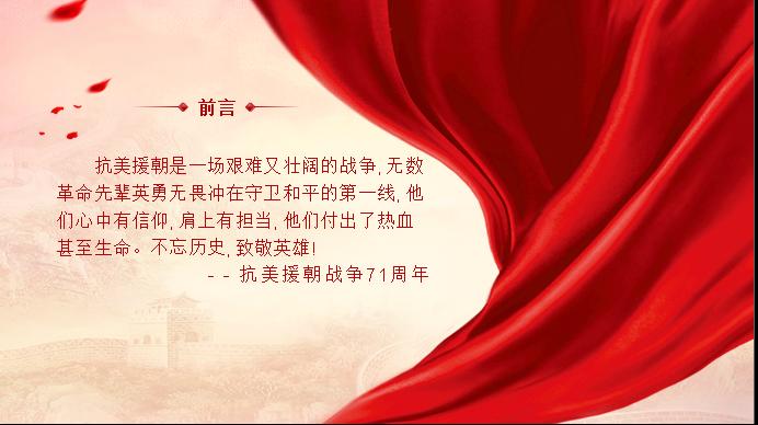习近平总书记指出,在波澜壮阔的抗美援朝战争中,英雄的中国人民志愿军始终发扬祖国和人民利益高于一切、为了祖国和民族的尊严而奋不顾身的爱国主义精神,英勇顽强、舍生忘死的革命英雄主义精神,不畏艰难困苦、始终保持高昂士气的革命乐观主义精神,为完成祖国和人民赋予的使命、慷慨奉献自己一切的革命忠诚精神,为了人类和平与正义事业而奋斗的国际主义精神,锻造了伟大抗美援朝精神。