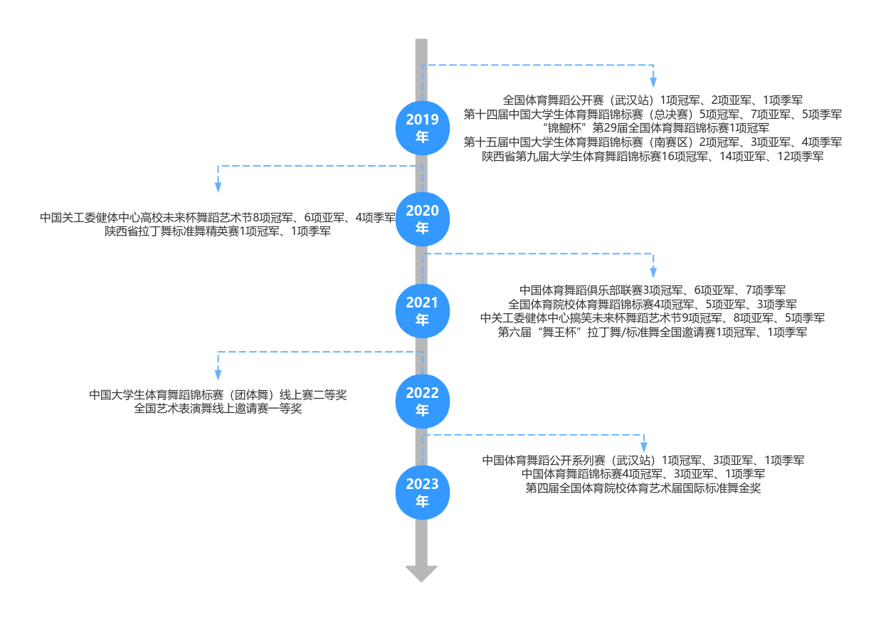 本课程从2006年开课至今已经历16年的教学实施过程,在2008、2012、2016、2018、2020、2022年分别进行了6次培养方案的修订及教学大纲的重新编撰。先后被授予“优秀教学团队”;“校级精品课程”;“校级优质课程”;陕西省体育舞蹈(标准舞)运动后备人才培训基地;校级师德建设先进集体荣誉称号;国家教育部大学生体协体育舞蹈分会副主席单位;陕西省教育厅学生体协体育舞蹈分会秘书长单位;校级“一流课程”;舞蹈作品《弈》、《薪火》分别获获得第三届、第四届全国体育院校学生体育艺术节金奖;多次获得全国及省级多项冠军。从单一的课堂教学,发展为融教学、训练、科研、创编、汇报展演、社会实践为一体的人才培养体系。