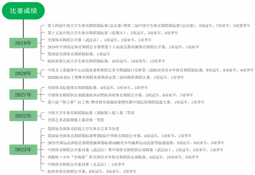 本课程从2006年开课至今已经历16年的教学实施过程,在2008、2012、2016、2018、2020、2022年分别进行了6次培养方案的修订及教学大纲的重新编撰。先后被授予“优秀教学团队”;“校级精品课程”;“校级优质课程”;陕西省体育舞蹈(拉丁舞)运动后备人才培训基地;校级师德建设先进集体荣誉称号;国家教育部大学生体协体育舞蹈分会副主席单位;陕西省教育厅学生体协体育舞蹈专委会主任、秘书长单位;省级“一流课程”;舞蹈作品《弈》、《薪火》获得第三届、第四届全国体育院系学生体育艺术节金奖;多次获得全国及省级多项冠军。从单一的课堂教学,发展为融教学、训练、科研、创编、汇报展演、社会实践为一体的融合体系。