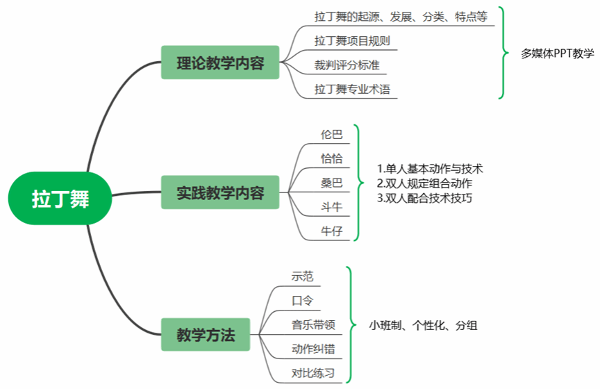 运用示范、口令、音乐带领、动作纠错、对比练习等教学方法,采用小班制、个性化、分组学习的模式,进行以下教学内容:理论教学内容:采用多媒体PPT教学,包括拉丁舞的起源、发展、分类、特点;拉丁舞项目规则;裁判评分标准;拉丁舞专业术语内容。实践教学内容:包括伦巴、恰恰、桑巴、斗牛、牛仔舞的单人基本动作技术;双人规定组合动作;双人配合技术技巧内容。