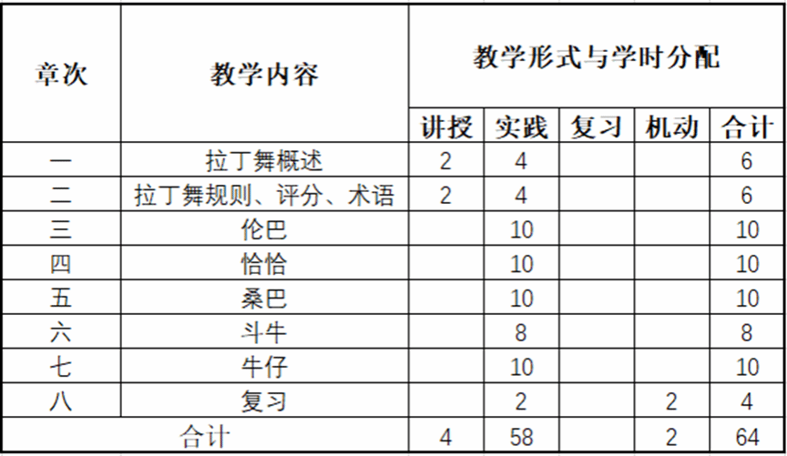 必修专业课程,舞蹈表演专业大一第1学期开设,每学年拉丁舞课程开设6个班。具体情况如下:
