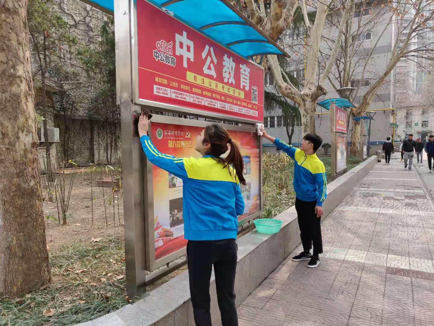 此次活动由体育艺术系2017级辅导员刘薇带队,17级各班学生干部积极参与,通过打扫校园卫生,擦拭公告栏,清理垃圾等实际行动,响应了毛主席向雷锋同志学习的号召。