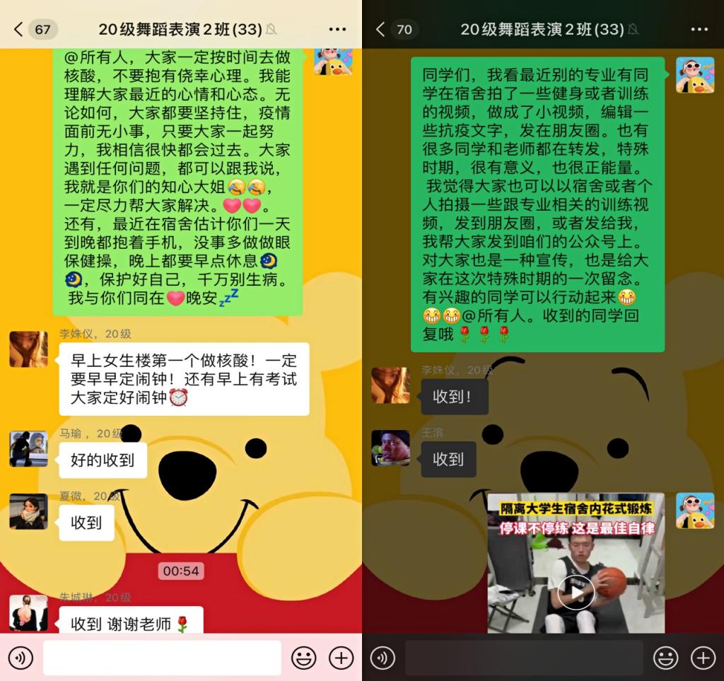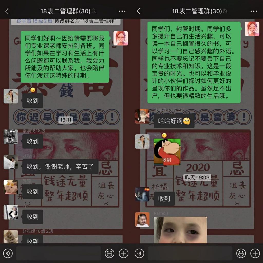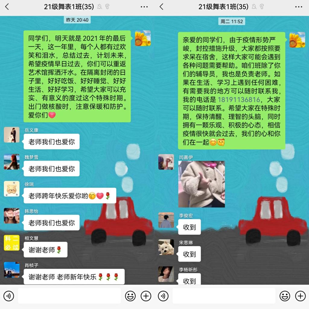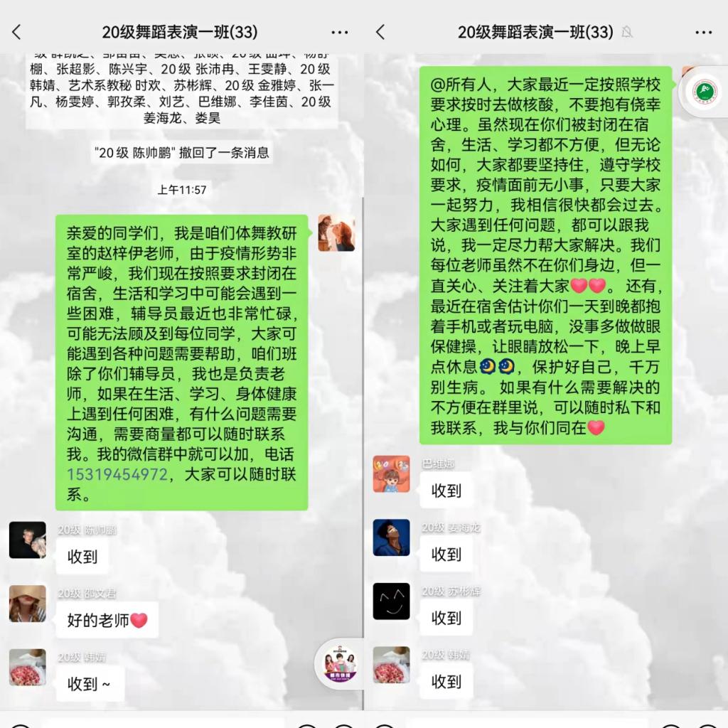 西安的疫情牵动着我们每个人的心,同时也被封闭在家,尤其是在学校的学生们,他们的活动空间小,环境不比在家里,难免在心态和心情都有影响。我们每个老师负责一个班学生,对学生们进行心理疏导与关心,通过微信群、腾讯会议等平台对学生进行了互动,尽可能了解学生目前的生活及学习情况,给予力所能及的帮助,对有特殊需求、急需解决的做以统计,立即上报学院。同时也会叮嘱学生做好隔离期间的个人防护,遵守学校要求,每天按时完成核酸检测,并将结果发到群里,勉励学生封闭期间调整心态,认真学习,完成本学期各科课程。停课不停学,隔离不隔心。我们的一句关心和问候会给学生很大的鼓励。这次的线上交流不仅是为了防护疫情。更是一次拉进师生之间的关系的特殊纽带。有人负重前行,有人为民而战,我相信,我们很快就能战胜病毒。365官网,加油!