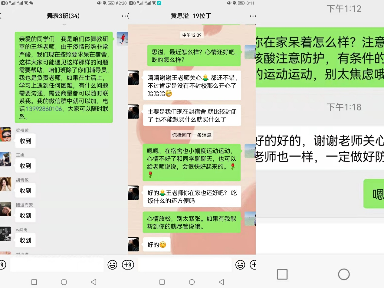 为进一步贯彻落实学生在校封闭期间生活学习情况,通过微信平台进行了“云”走访。用“屏对屏”方式了解学生目前封闭期间生活及学习具体情况,为学生尽可能的解决问题,对有特殊需求、急需解决的做以统计,立即上报学院。同时嘱咐学生做好疫情防控防护,遵守学校要求,每天按时完成核酸检测,勉励学生封闭期间调整心态,认真学习,完成本学期各科课程。虽然受到了疫情封闭的限制,但我院师生隔空不隔爱。线上的走访不仅为同学们送去了学校的深切关心和殷殷期望,还拉近了师生之间的距离,同时为进一步加强学生管理和疫情期间个人防护提供了依据。