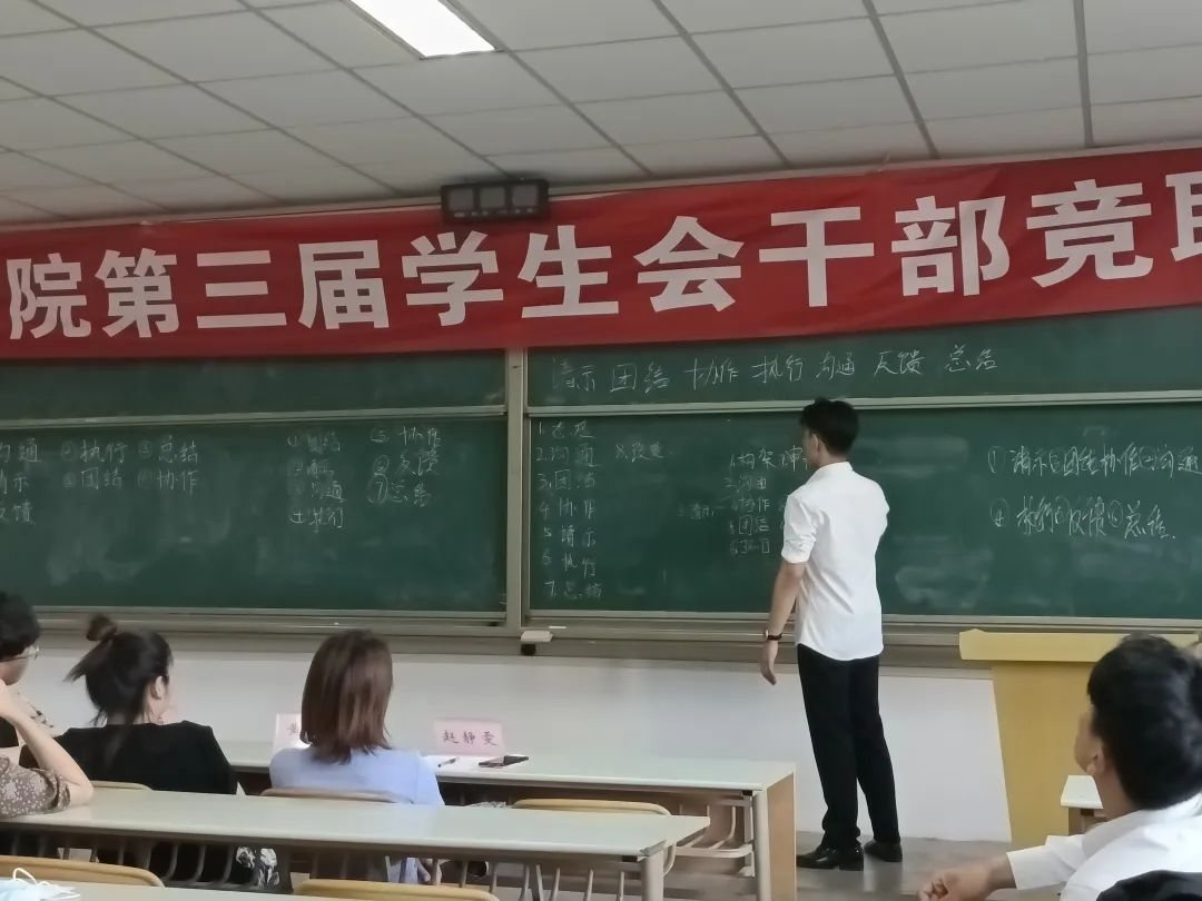 竞选现场,选手们认真准备发言,分别从自身能力与特点出发,详细阐述了各自的经验能力和对未来学生会工作的看法和展望。