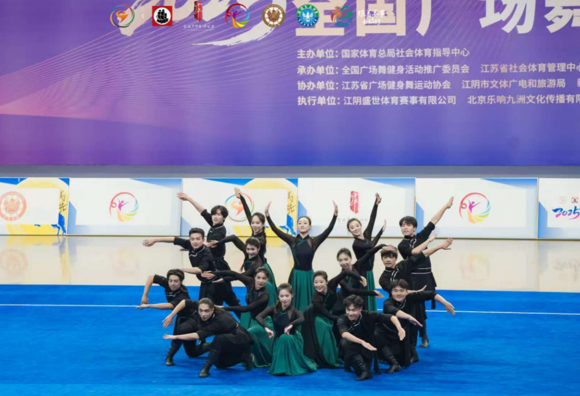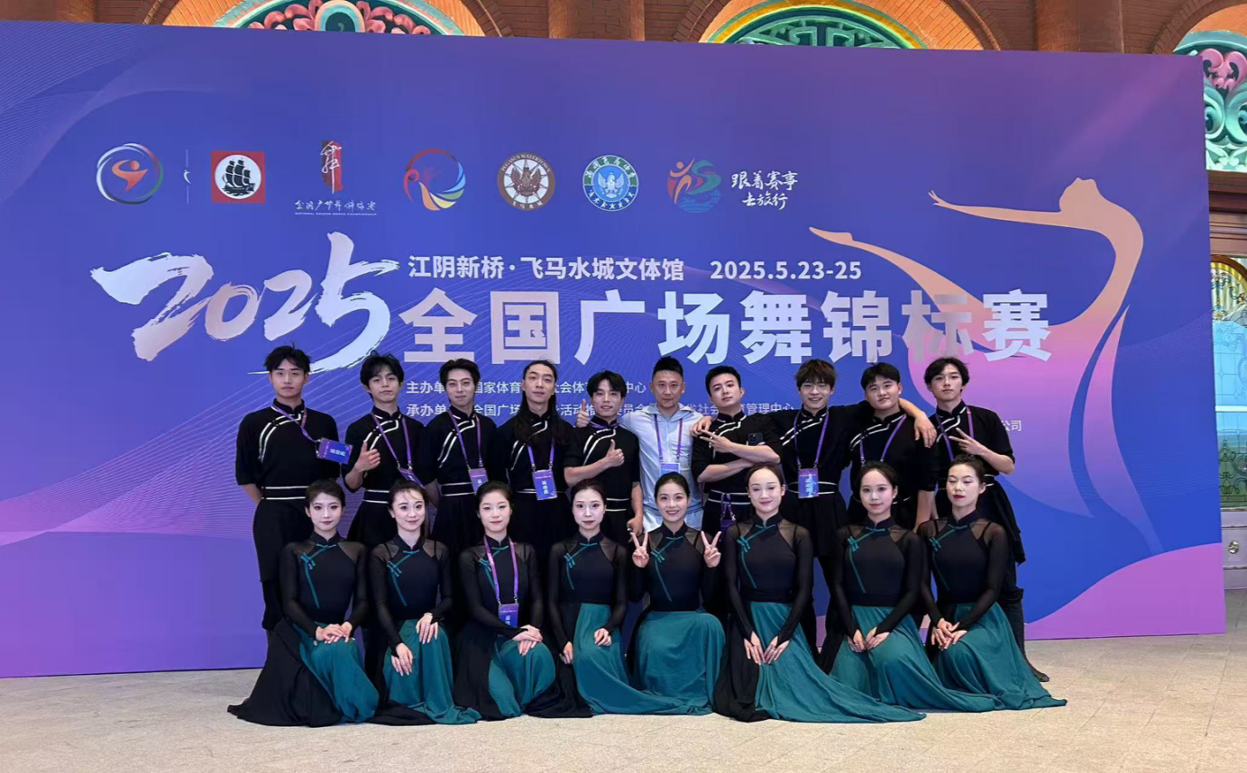 2025年5月23日至25日,由国家体育总局社会体育指导中心主办的全国广场舞锦标赛在江苏省江阴市新桥镇飞马水城文体馆举行。来自全国52支代表队、750余名选手同场竞技。艺术学院选派17名学生组成代表队参赛,凭借自编套路《草原儿女》及规定套路《美丽中国》的出色表现,分获高校甲组一等奖、二等奖,以双项佳绩展现高校舞蹈教学成果与青年学子的艺术担当。