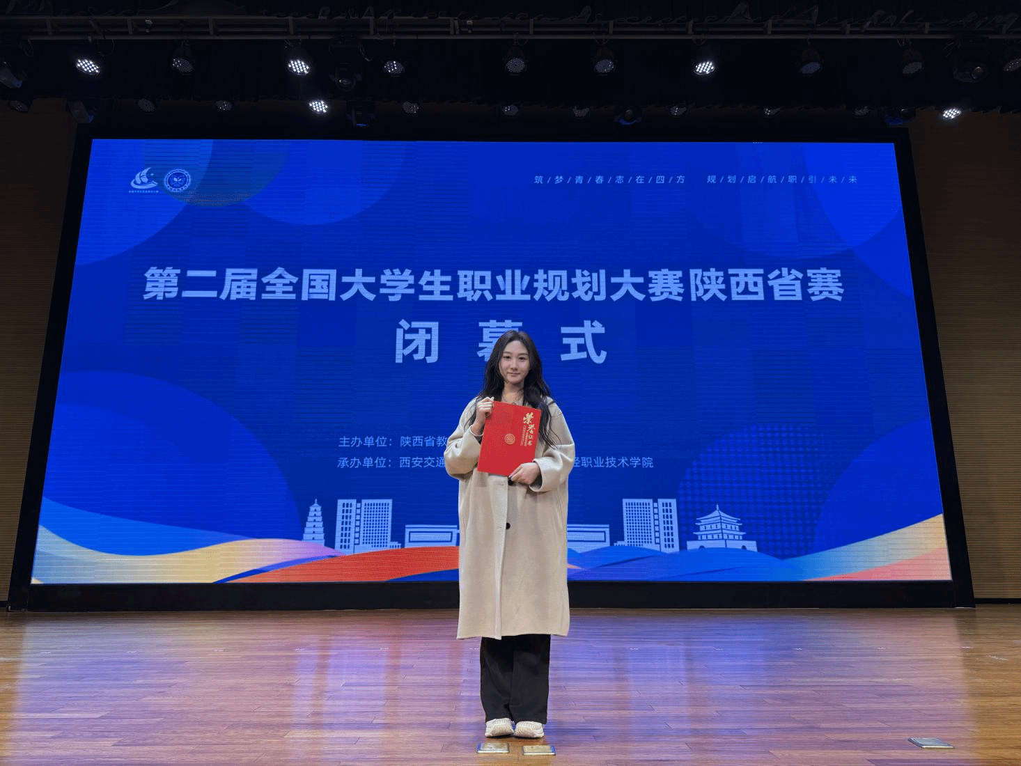 近日,由陕西省教育厅举办的第二届全国大学生职业规划大赛陕西赛区决赛落下帷幕,传媒学院2023级播音与主持艺术专业本科生孙艺萌凭借出色的职业规划能力和扎实的综合素养,喜获本科生组成长赛道铜奖,充分展现了传媒学子的卓越风采与学院的育人成效,为学校、学院争得荣耀。