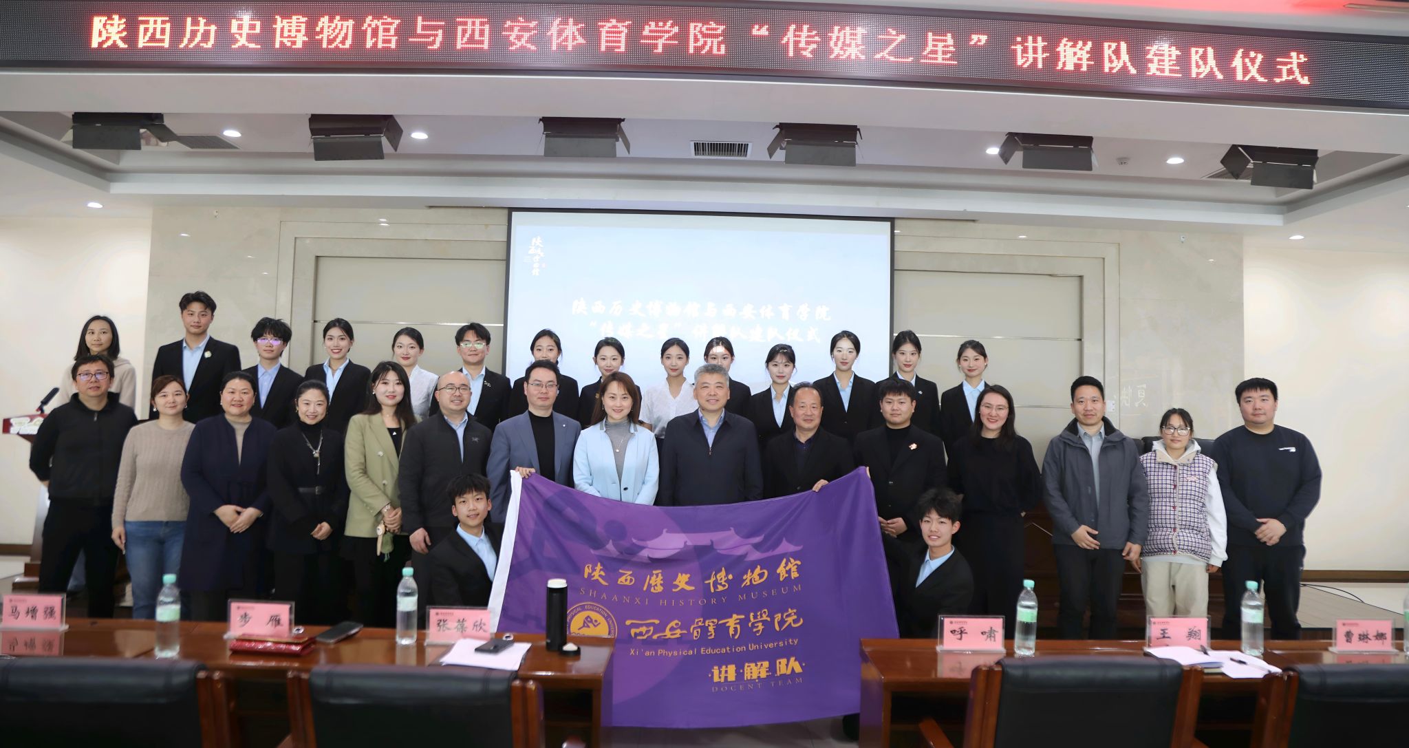陕西历史博物馆副馆长步雁向365官网副校长张葆欣授予队旗,陕西历史博物馆社会教育部主任呼啸为365官网15名大学生讲解员授予工牌。