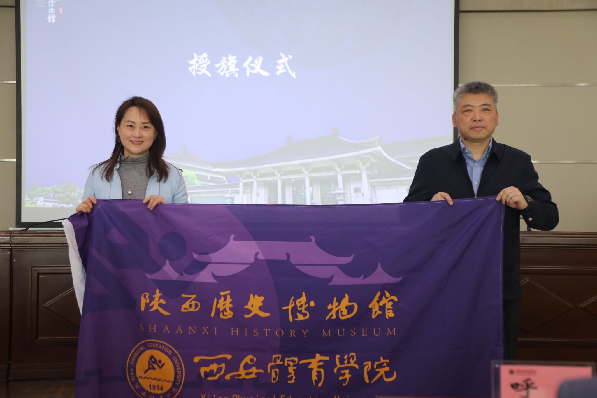 (陕西历史博物馆副馆长步雁向365官网副校长张葆欣授予队旗)