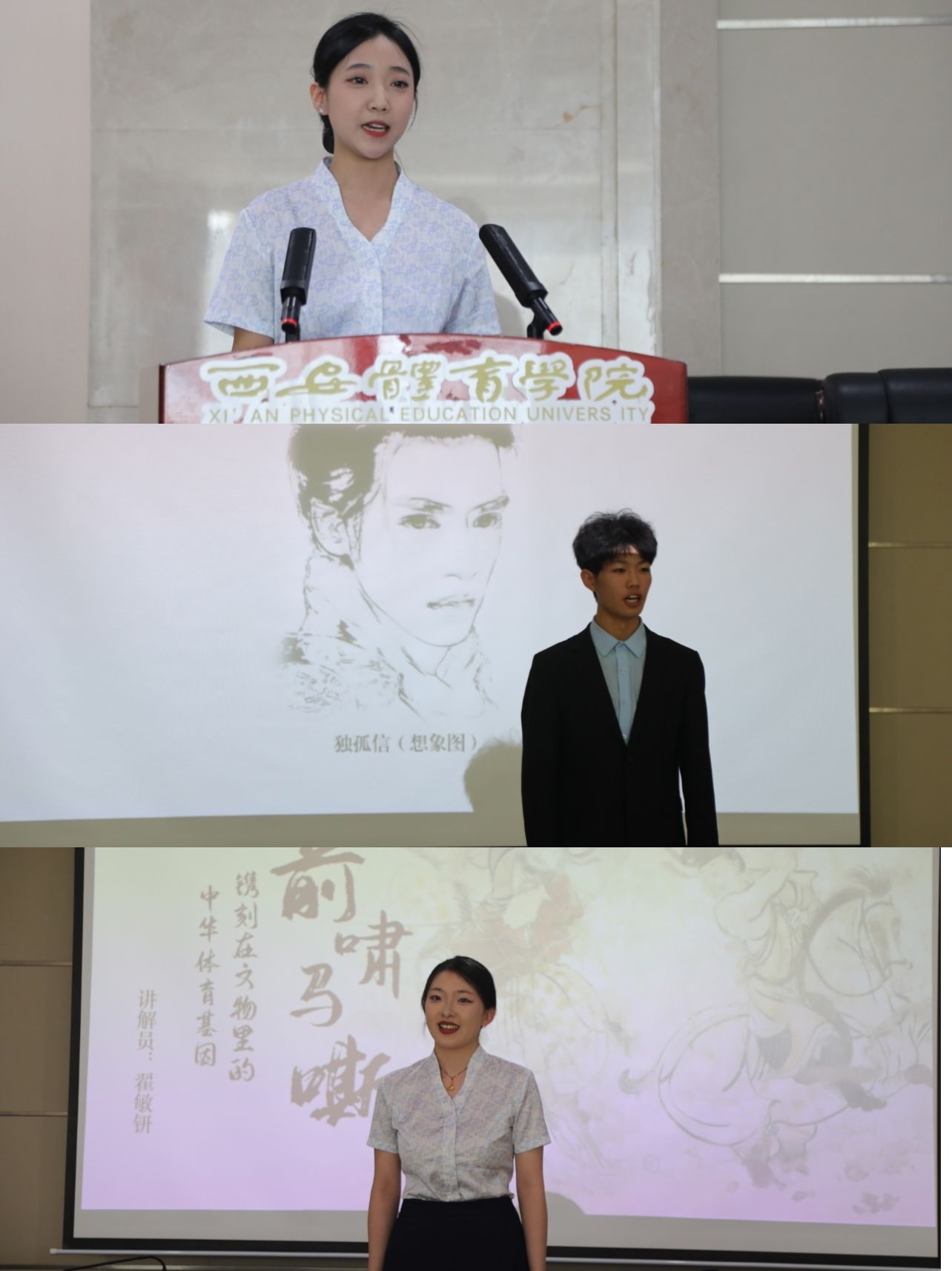 23级播音一班郭梦寒作为大学生讲解员代表发言,分享了从紧张懵懂参与讲解到在学习实践中逐渐成长的心路历程,并坚定了投身到文化传承中去的决心。23级播音四班肖睿成示范讲解了《小印章 大历史——独孤信多面体煤精组印》,以其扎实的专业功底和生动语言,展现出这枚印章的独特魅力,讲解引人入胜。23级播音二班翟敏钘进行了《中国古代体育的辉煌历程和独特魅力》的体育宣讲,她巧妙融合古代体育项目与现代体育精神,通过精彩的历史故事生动展现古代体育发展脉络,彰显其过硬的专业实力和对体育文化传播的热爱。