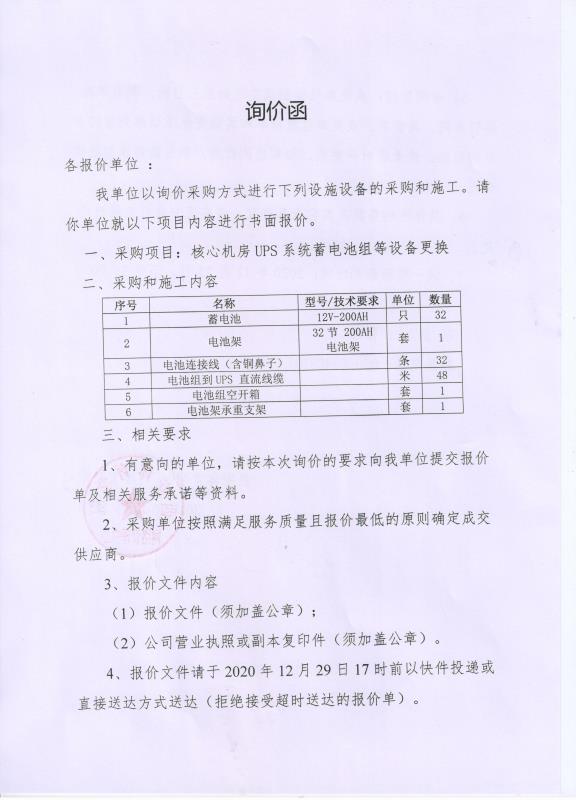英国365上市公司官网核心机房UPS系统蓄电池组等设备更换采购询价函