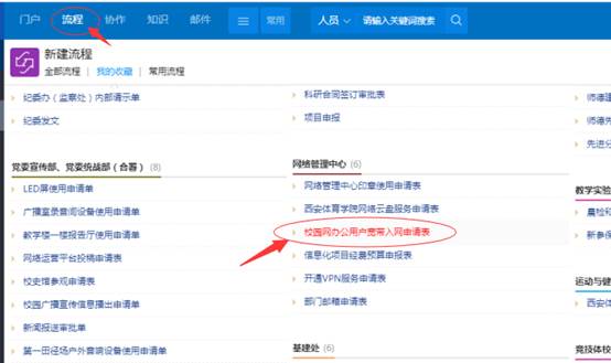 答:需使用校园网的教职工(此处指未拥有账号的新办公用户),首先请登录您自己的OA办公平台,在“新建流程”中找到“网络管理中心”选择“校园网办公用户宽带入网申请表”进行填写。(请注意一定要按照填写提示规范填写:“所在部门要写清楚是哪个学院的哪个教研室或者办公室,安装地址是哪个楼/场馆/公寓的某层几号办公室”)上传您的工作证和身份证后,提交流程即可。