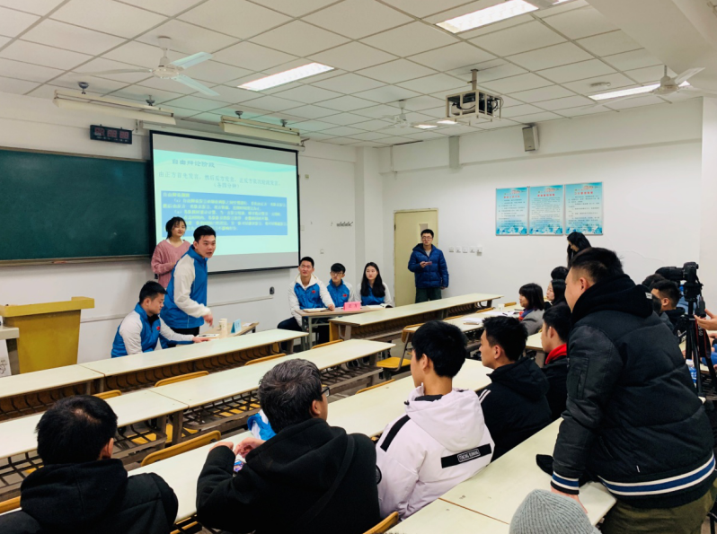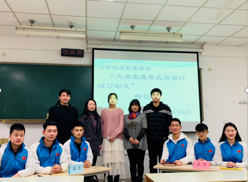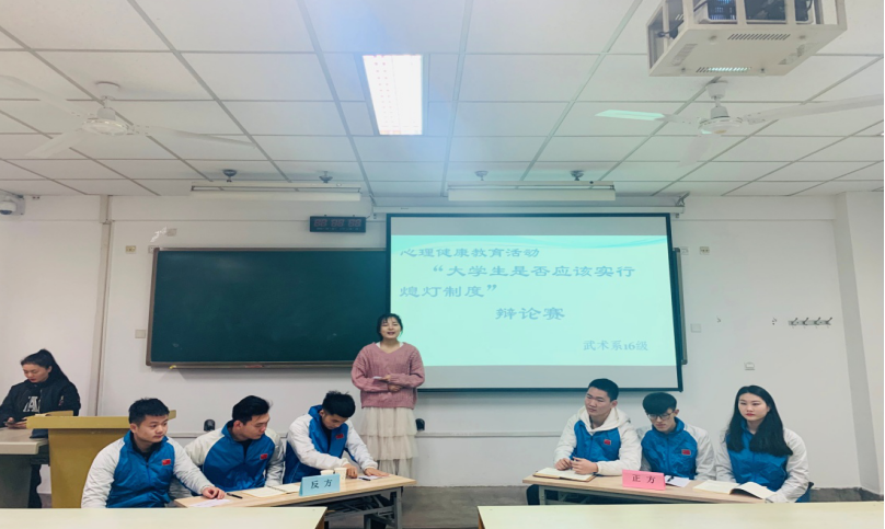英国365上市公司官网武术系16级于二零一九年一月四号上午十点在108教室开展了以心理健康教育主题活动。以‘大学生是否应该实行熄灯制度’为主题开展了一场激烈的辩论赛。此次辩论赛除了16级全体同学,辅导员王华老师和赵佳鹏老师外,我们还有幸请到了学工部心理健康教研室刑美辰主任和苏丹宁老师。