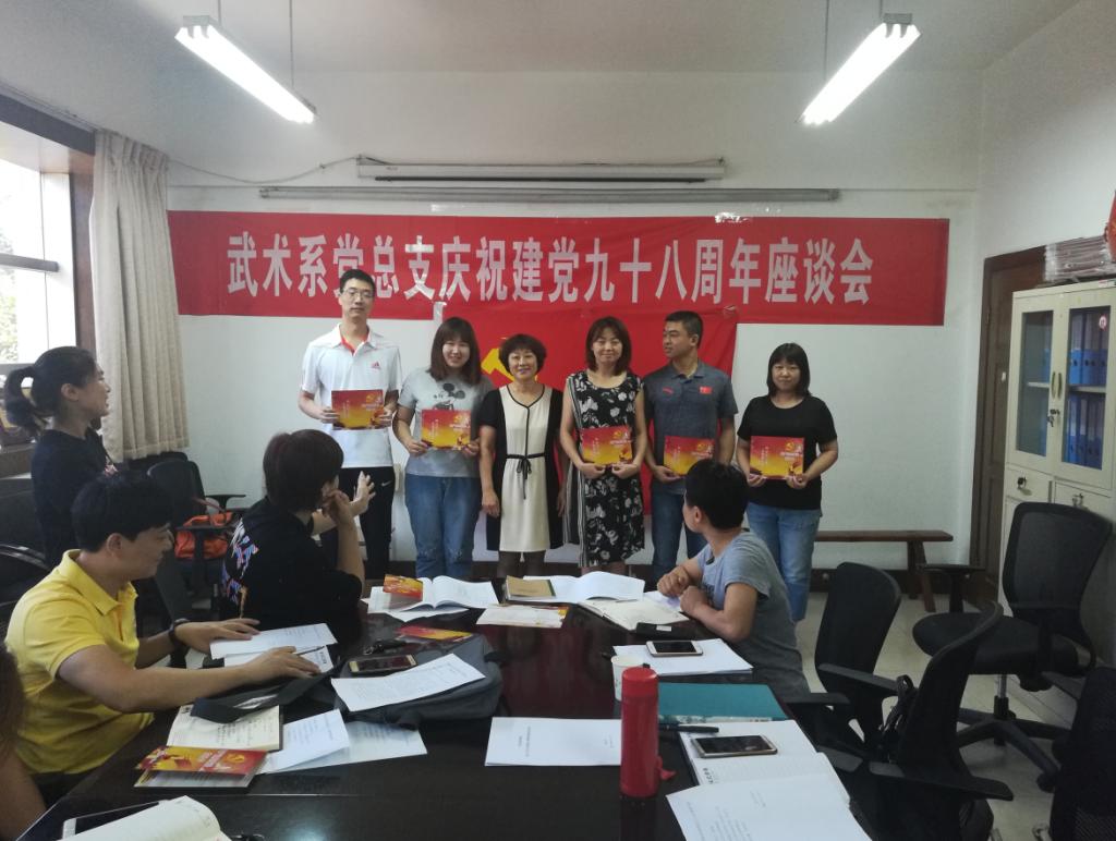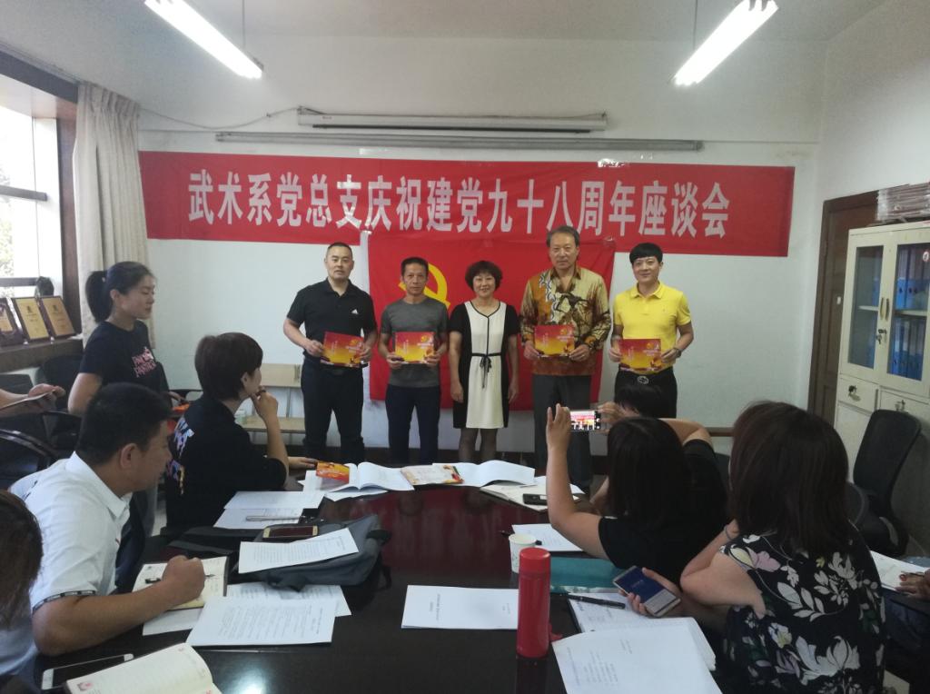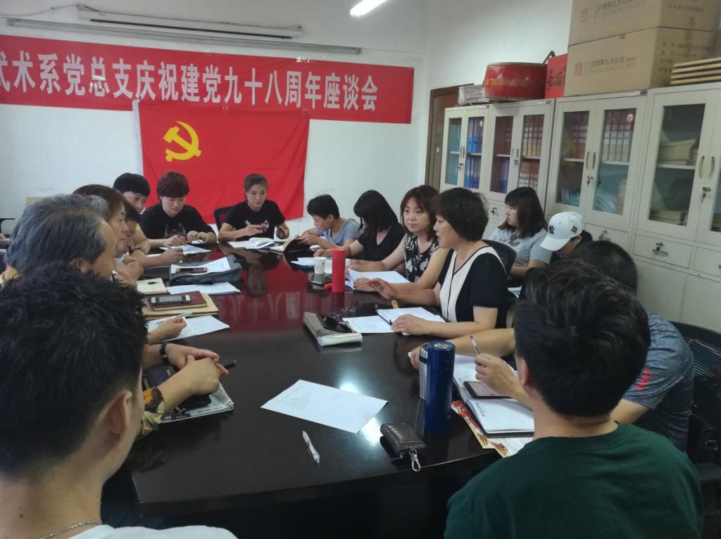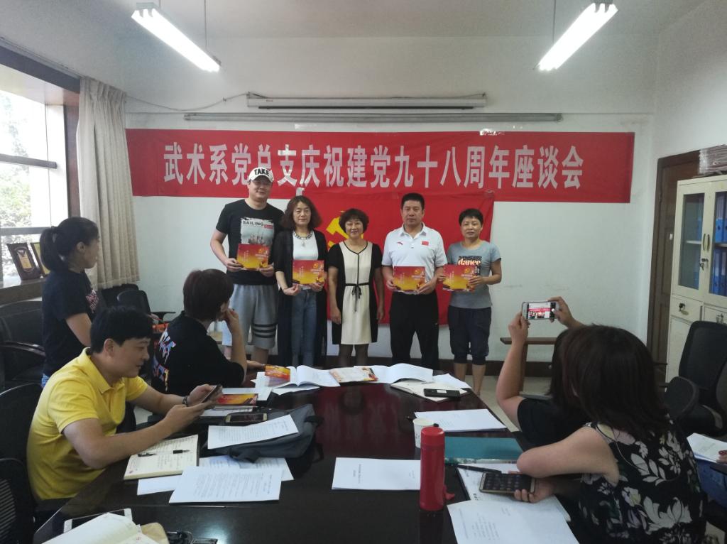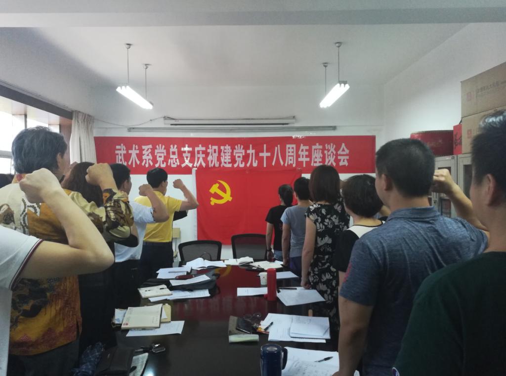 7月1日上午,在庄严的国歌声中,武术系党总支“牢记初心不忘使命,努力推进三风建设”庆祝建党九十八周年座谈会拉开了帷幕。武术系党总支全体党员参加了会议,会议由总支委员纪伟主持。