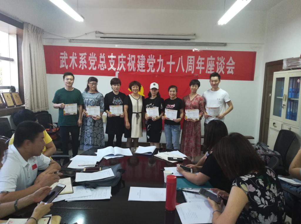 武术系党总支书记梁咏梅在致辞中回顾了我党九十八年来波澜壮阔的发展历程,勉励全体党员要始终牢记中国共产党人的初心和使命,就是为中国人民谋幸福,为中华民族谋复兴。为使全体党员时刻牢记初心,不忘使命,党总支委员王华带领大家重温了入党誓词。武术系党总支还为每位党员颁发了政治生日贺卡。