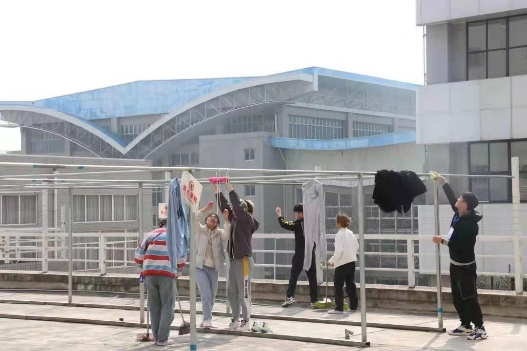 同学们不怕脏,不怕累,打扫了6号公寓3楼平台。大家认真仔细的擦拭每一个衣架,清扫每一个角落。各部门分工明确,相互配合,发挥爱校荣校的奉献精神。