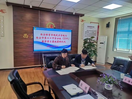 武术学院副院长李正恩(右一)与西安市第七十中学分校(西安市第二十五中)张小娟(左一)签署合作协议