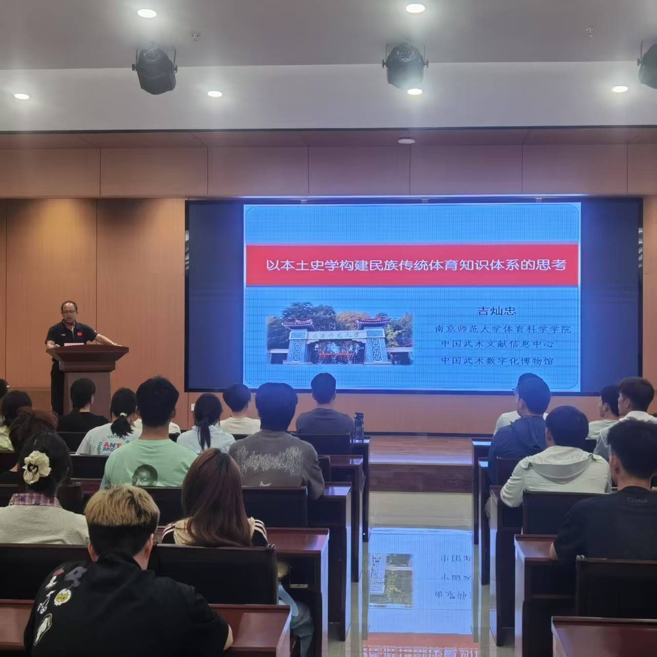 5月28日下午,中国武术文献信息中心研究员、中国武术数字化博物馆专家、南京师范大学体育科学学院副院长、博士生导师吉灿忠教授应邀出席英国365上市公司官网2025年系列学术讲座(第三场)活动,为365官网百余名师生进行“以本土史学构建民族传统体育知识体系的思考”为题的专题讲座,专题讲座在鄠邑校区教学综合楼541会议室举行。武术学院副院长李正恩主持学术讲座。
