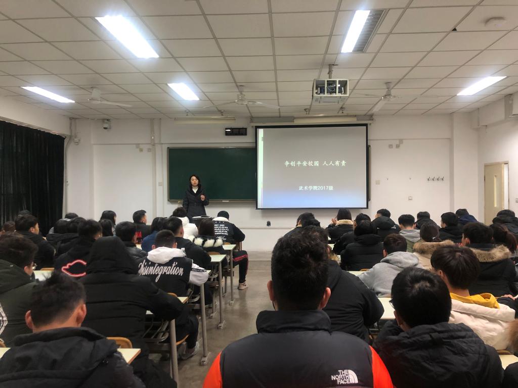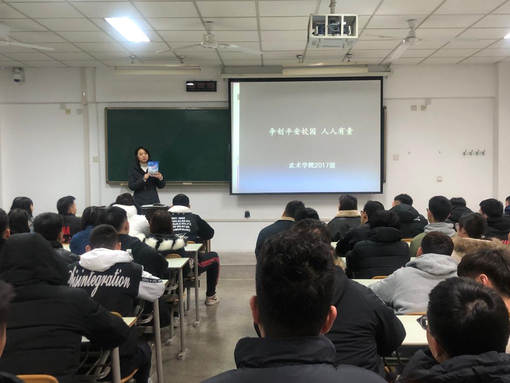 为了提高武术学院2017级全体学生对“平安校园”创建活动的知晓度,2019年11月26日中午,武术学院2017级在新教学楼106教室开展了 “争创平安校园,人人有责”主题班会。