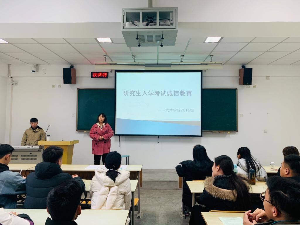 为了严肃考风考纪,加强青年大学生的诚信教育,2019年12月13日,武术学院2016级在教学楼307教室开展研究生入学考试“诚信教育”主题活动。2016级辅导员王华主持此次活动,2016级所有考研同学参加。