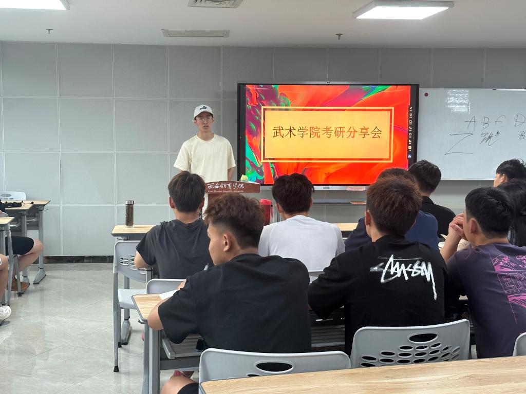 为充分发挥武术学院优秀学子榜样引领作用,帮助同学了解考研形势,高效谋划,增强备考信心,武术学院于5月21日晚7点在棒球馆103教室召开了考研分享会,参加会议的有 22级辅导员高梁老师,优秀学子代表武泽宇,黄文俊,何朝原受邀出席本次分享会,与同学们交流分享经验。会议由武术学院学工办主任王华老师主持。