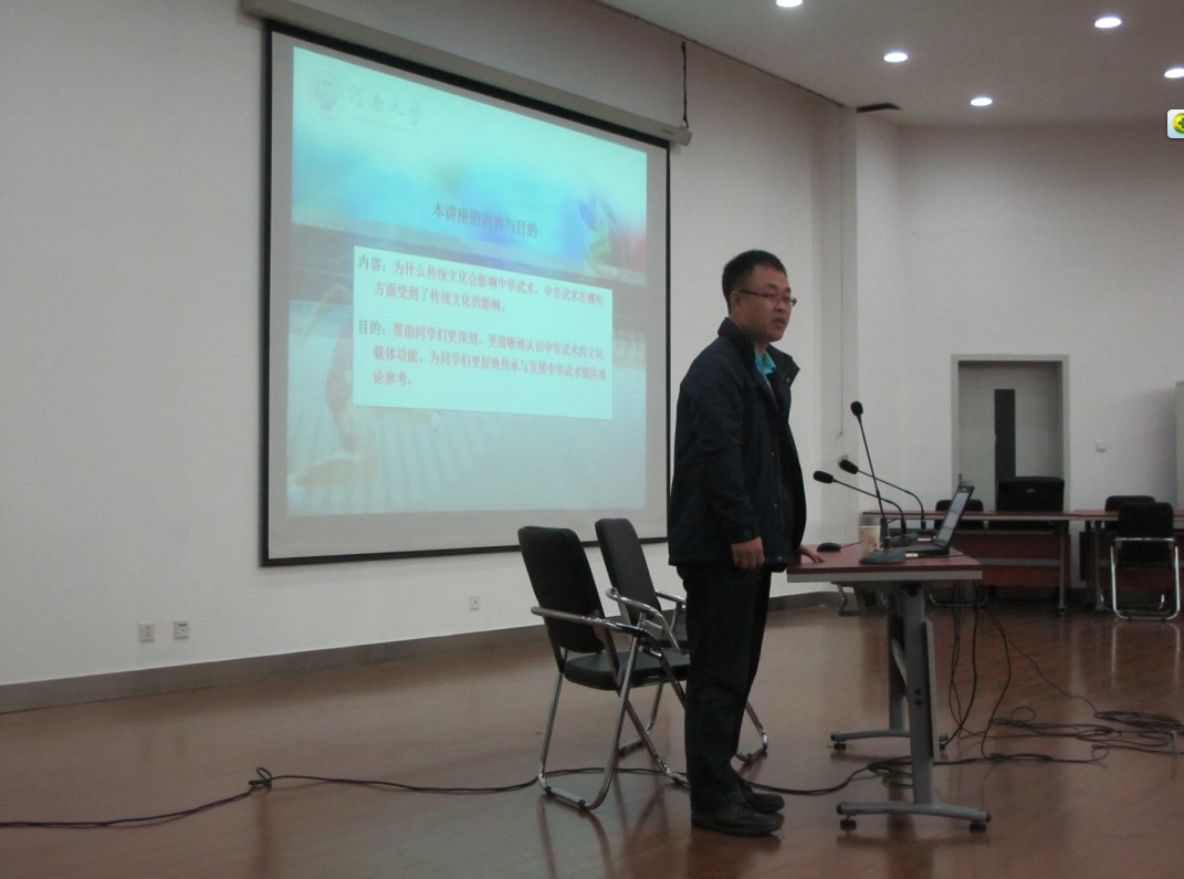 为配合创建省级文明校园活动,进一步提高武术系师生对这一活动的重视,同时,积极鼓励学生传承和发展中华武术,从而提高我系专业建设水平,武术系特别邀请河南大学体育学院副院长、博士生导师乔凤杰教授于11月9日晚7点在教学楼五楼报告厅,作题为《中华武术与传统文化》的学术讲座。讲座由武术系主任马文国主持。