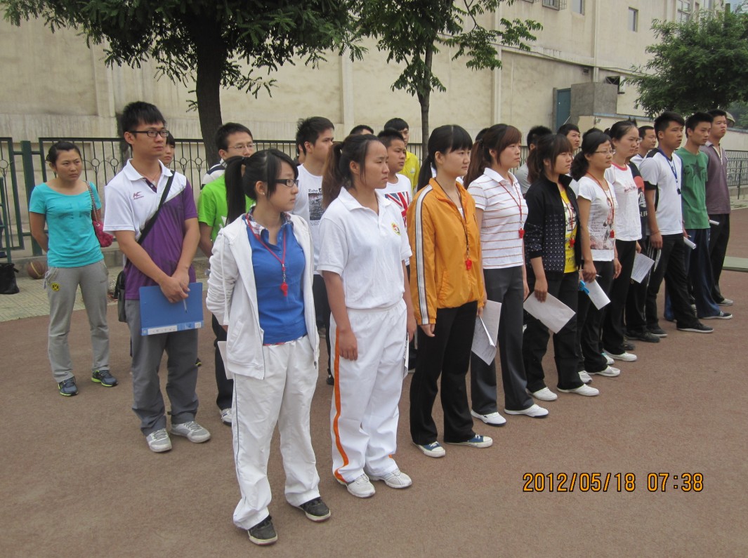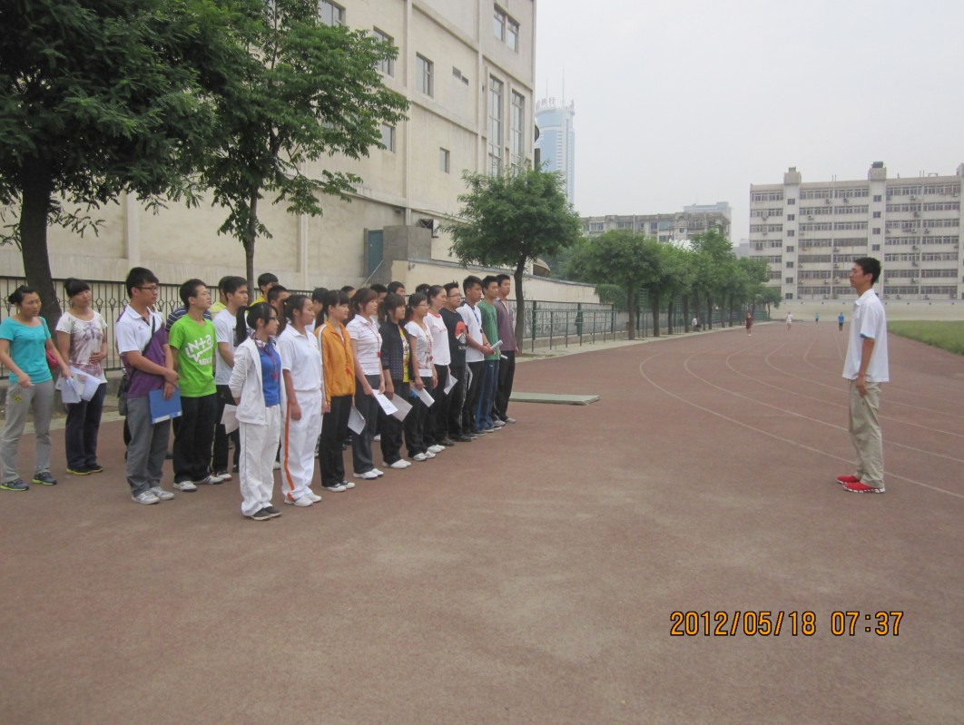 2012年5月18日上午,我系2012届40多名毕业生在第二田径场参加了教师资格证模拟考试。武术系主任马文国、党总支书记李美霞、办公室主任牛兆林、教学秘书邓春艳以及年级主任王华、纪伟和08级辅导员老师滑勇在考试现场进行巡视和协调指挥。
