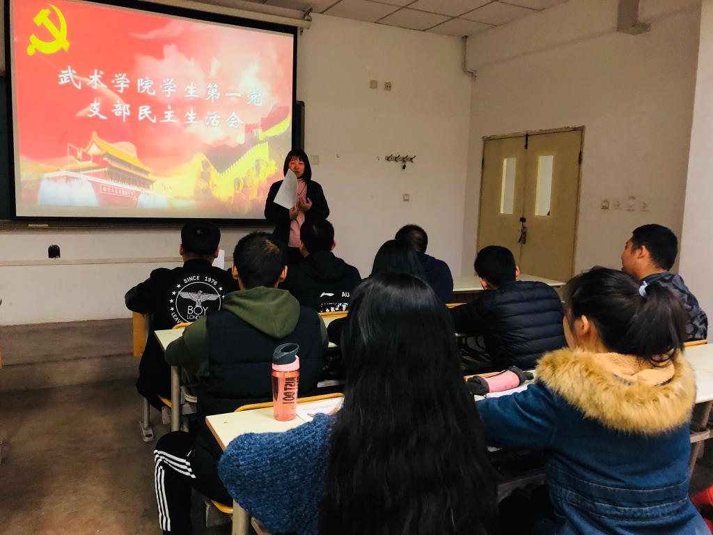 20191029日,武术学院学生第一党支部在教学楼103教室组织召开了民主生活会,支部书记王华主持会议。