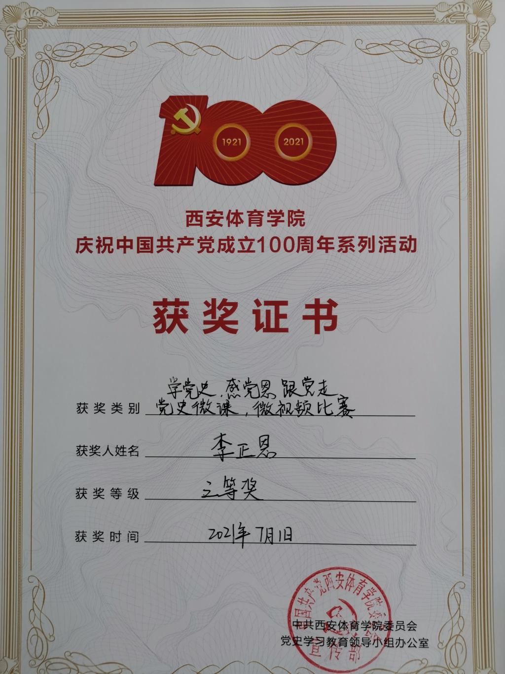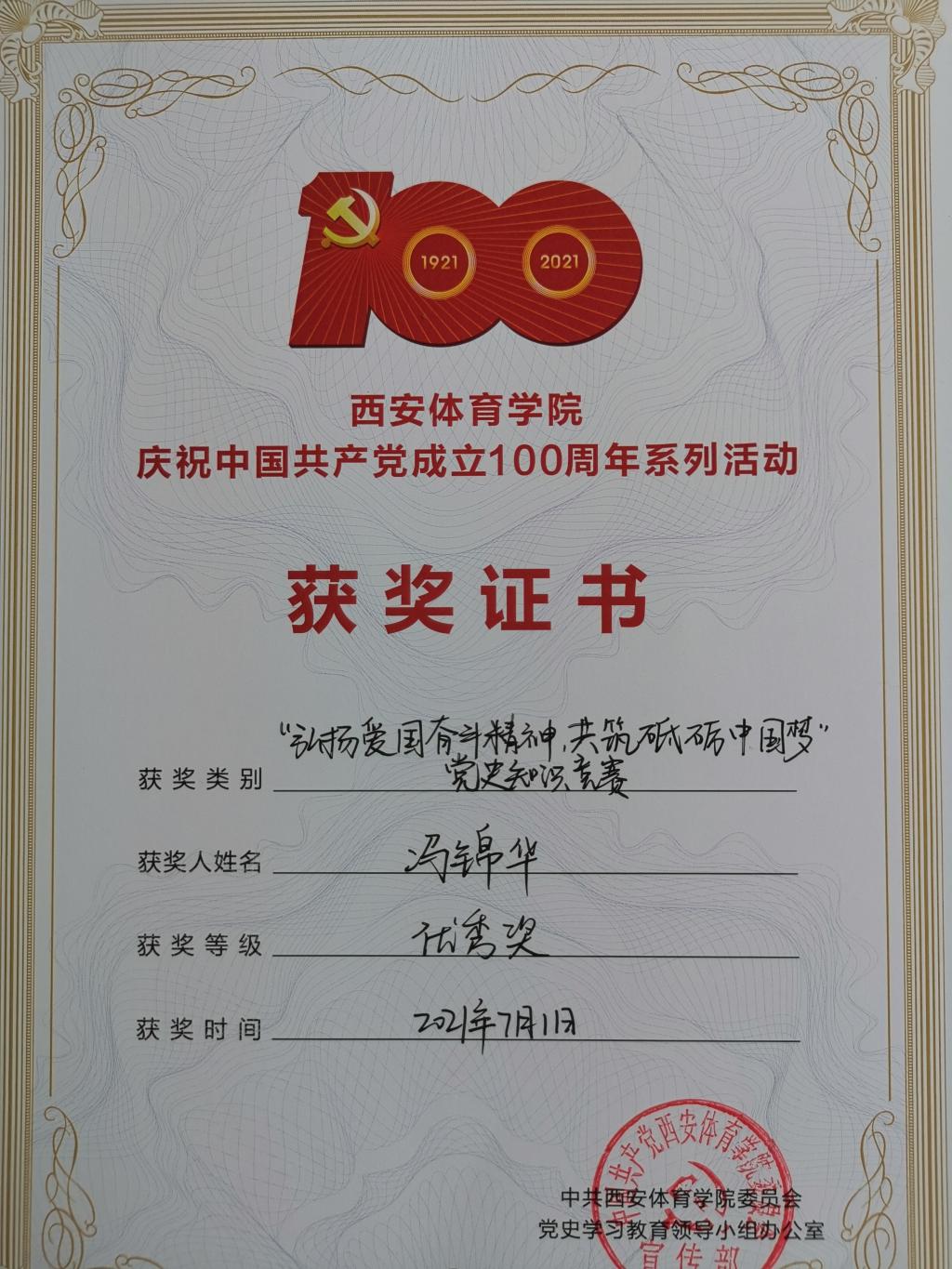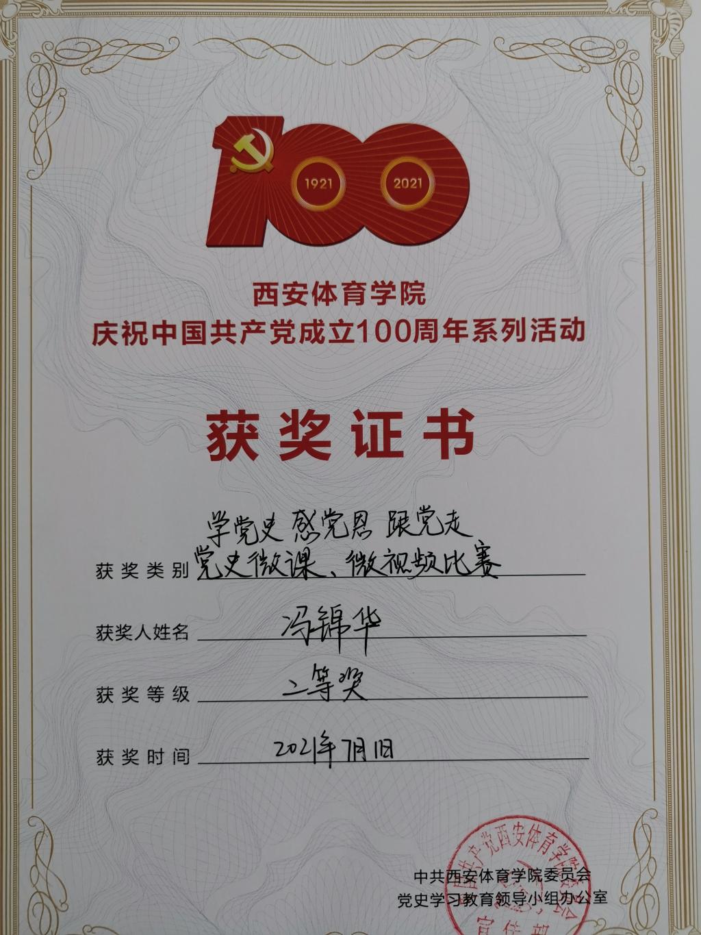 为深入贯彻落实习近平新时代中国特色社会主义思想,深入开展党史学习教育,庆祝中国共产党成立100周年,英国365上市公司官网开展了“庆祝中国共产党成立100周年”系列活动。在“学党史 感党恩 跟党走”——党史微课、微视频比赛活动中套路教研室教师冯锦华录制的微视频获得二等奖;李正恩录制的微视频获得三等奖。在“弘扬爱国奋斗精神,共筑砥砺中国梦”党史知识竞赛活动中冯锦华获得优秀奖。