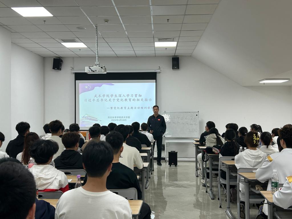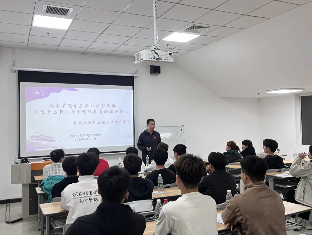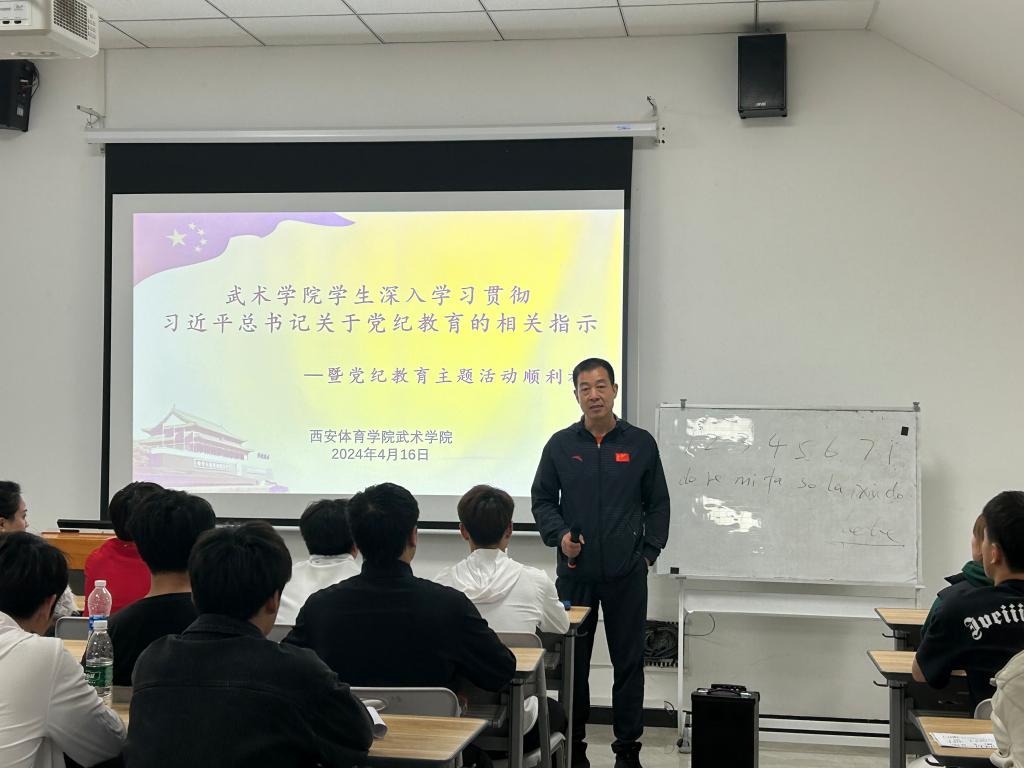 为深入学习贯彻习近平总书记关于开展党纪学习教育的重要讲话和重要指示精神,按照《英国365上市公司官网党纪学习教育实施方案》,4月16日,武术学院在鄠邑校区开展党纪学习教育主题会议。武术学院党总支书记刘耀荣主持会议并做动员讲话,武术学院团委书记、学工办主任王华,2022级辅导员高梁,兼职辅导员李玉洁及2022、2023级本科生参加了会议。