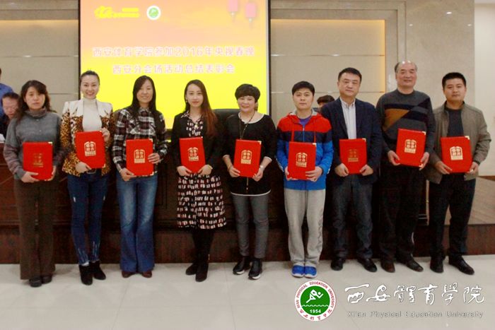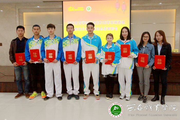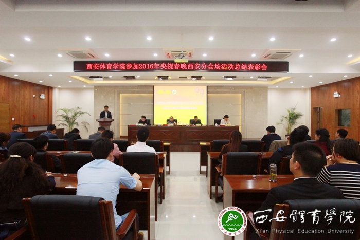 本网讯 为总结经验,营造奋发、健康、向上的校园文化氛围,激发师生凝心聚力、团结奋斗的强大动力,鼓舞新学期师生士气,3月16日,我院在新网球馆六楼会议室召开参加2016年央视春晚西安分会场活动总结表彰会,对参与承担本次活动的体育艺术系、党委宣传部、后勤管理处、学生处、竞技体校、国资处、保卫处、财务处、教务处9个部门和赵志伟等165人(名单附后)进行表彰。党委书记吴长龄、院长周里、党委副书记王跃生、纪委书记赵军出席了会议。春晚活动协调小组全体成员、各党总支(直属党支部)书记、演出组全体演职人员、受表彰部门和人员、参演学生代表100余人参加了会议。吴长龄同志发表讲话,王跃生同志主持会议,赵军同志宣读表彰决定。