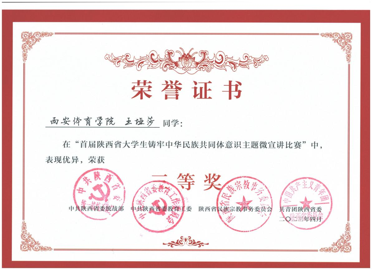首届陕西省大学生铸牢中华民族共同体意识主题微宣讲比赛于2022年8月启动,吸引了35所学校的学生参赛。365官网经过精心筹备,共选出3部作品参赛,经过层层评选,传媒学院播音系21级学生王垭莎的在主题微宣讲比赛中获三等奖。