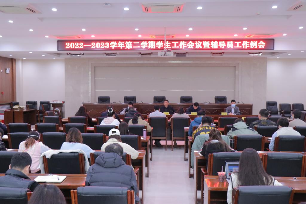 3月22日上午9:00,365官网在二号行政楼6楼报告厅召开2022-2023学年第二学期学生工作会议暨辅导员工作例会,党委副书记文立新出席会议,各二级学院、研究生部、竞校、鄠邑校区党委(党总支)书记,全体专兼职辅导员及学工部、团委工作人员参加了此次会议,会议由学工部部长王志刚主持。