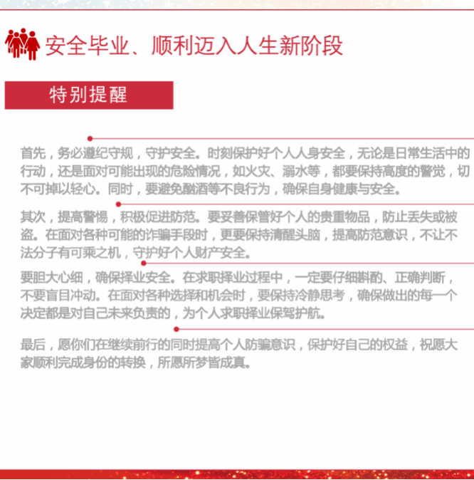会议伊始,以“安全毕业、顺利迈入人生新阶段”为主题展开,聚焦毕业生离校前重点安全问题,提出四项核心要求:1. 遵纪守规,守护人身安全;2. 提高警惕,防范财产风险;3. 胆大心细,保障择业安全;4. 提升防骗意识,维护合法权益。