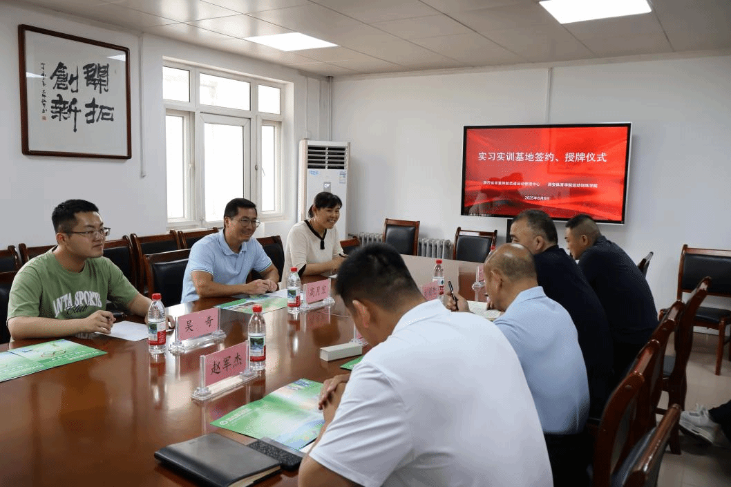 随后,双方签署合作协议,运动训练学院向省举摔柔中心授予实习基地牌,标志着长期合作机制正式建立。最后,全体参会人员合影留念,为此次深度合作留下珍贵记录。