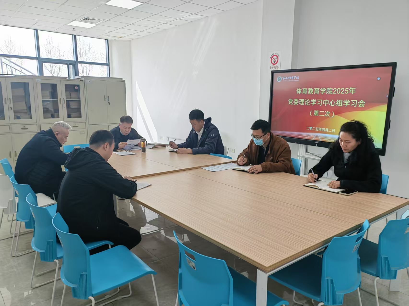42体育教育学院在鄠邑校区橄榄球馆110室召开体育教育学院2025年党委理论学习中心组第二次学习暨深入贯彻中央八项规定精神学习教育读书班第一次集体学习会,学院党委委员卢喆黄岗、宋耀伟、马文新、杨 辉、宗月民参会,会议由院党委书记卢喆主持。