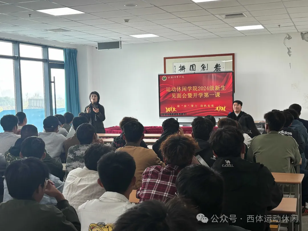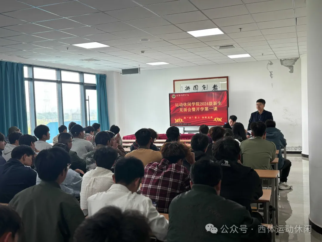 2024年10月25日中午,运动休闲学院2024级新生见面会在鄠邑区橄榄球馆301教室顺利召开。学院党总支书郭春玲,学院院长任超学,学院副院长胡婕婷、学院教学办叶莎莎、学院党政办主任董鹏举、社会体育教研室主任、研究生倒是代璐老师、2024级(本科、预科、研究生)辅导员等老师出席见面会,以及来自2024级(本科、预科、研究生)138名同学共同参加。新生见面会由党政办主任董鹏举主持。